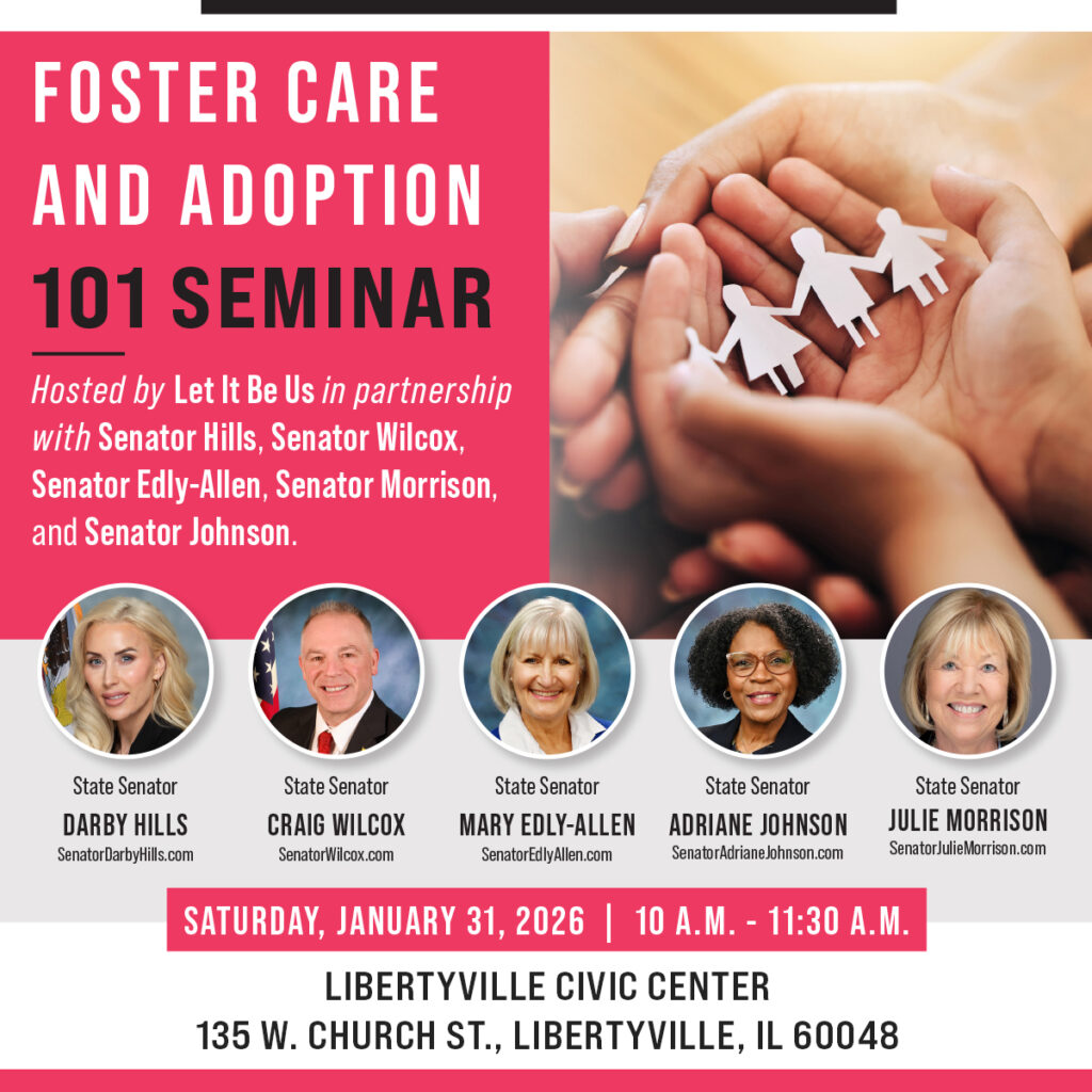 I’m proud to partner with Let It Be Us, State Senator Darby Hills, and a few other area legislators for a Foster Care and Adoption 101 Seminar that will be held on January 31st in Libertyville.